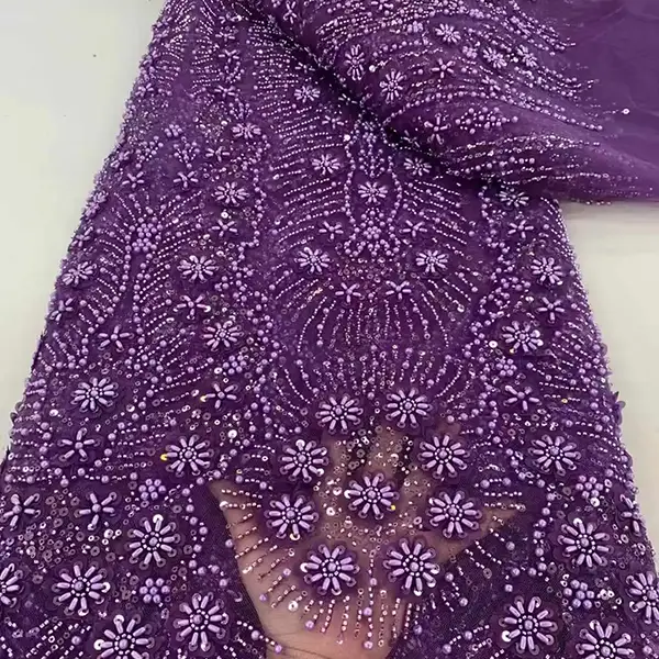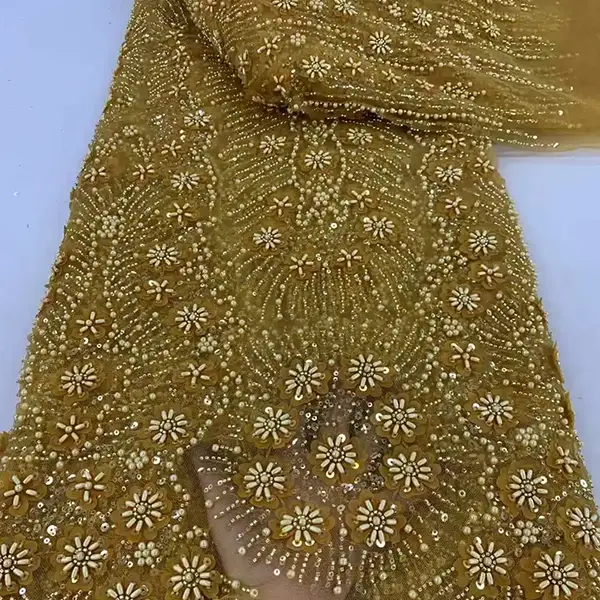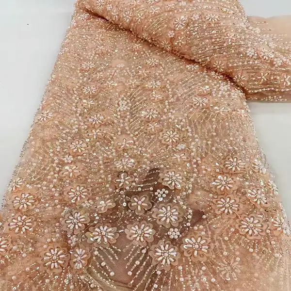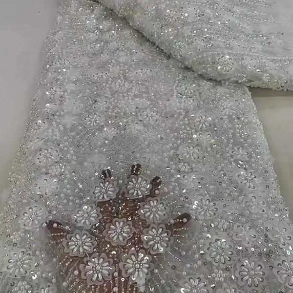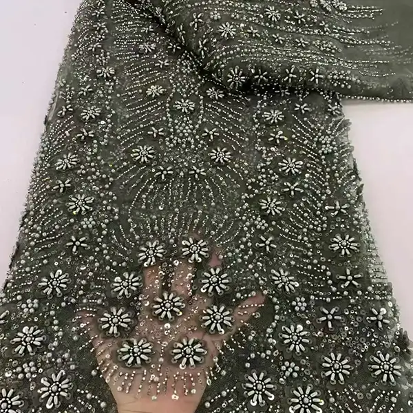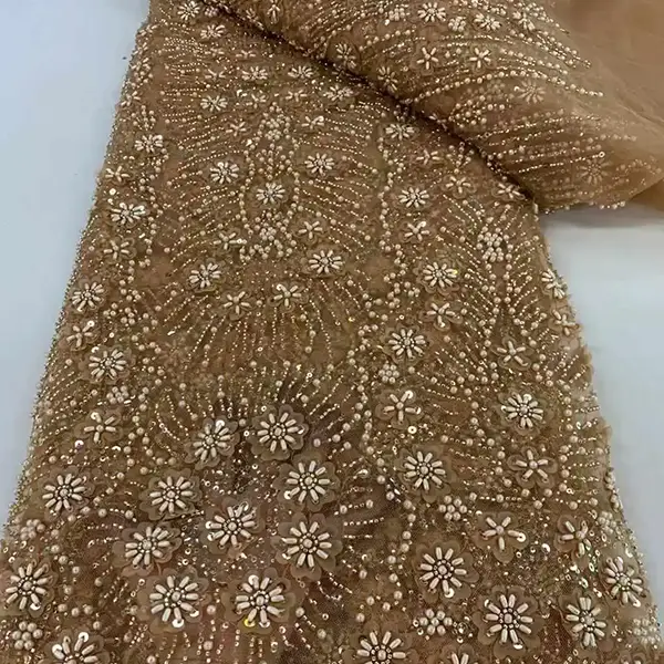 Lüks ağır yapılmış nakış tül boncukları, karmaşık boncuk işi ve hassas dantel içeren dantel örgü boncuklu kumaş. Yüksek yoğunluklu dikiş ve elle uygulanan boncuklar, gelin önlükleri, akşam kıyafetleri ve haute couture için mükemmel olan lüks doku yaratır. Zarif, parlak ve premium kalite.