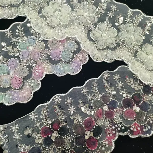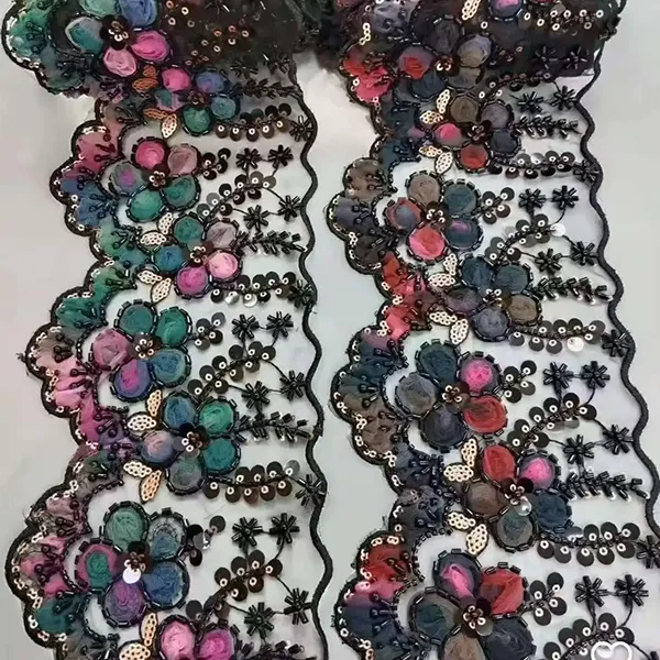 3D Mesh Çiçekli Çok Renkli İşlemeli Dantel Şerit Boncuklu Tüp Barkod Nakış Danteli
