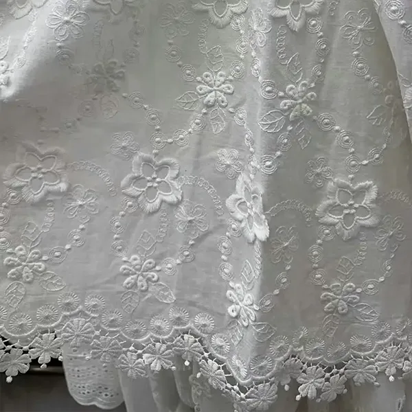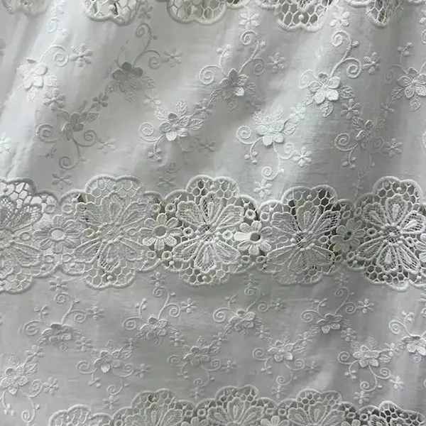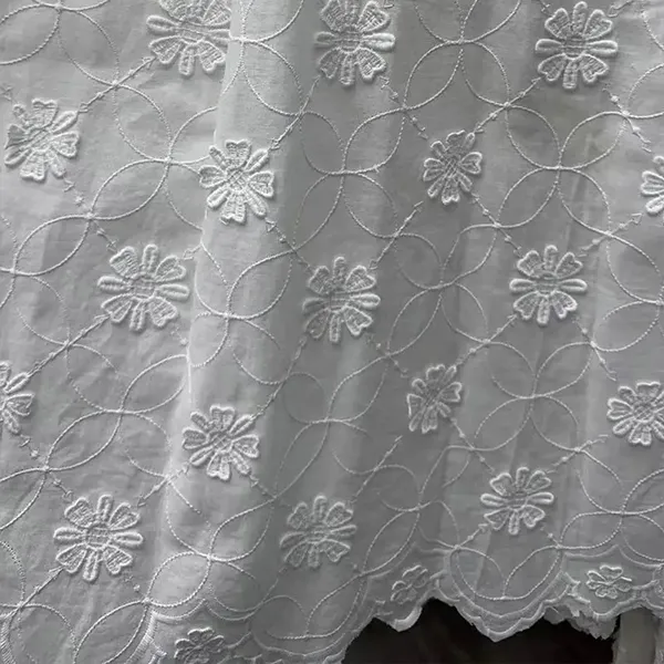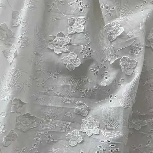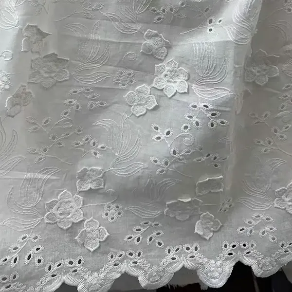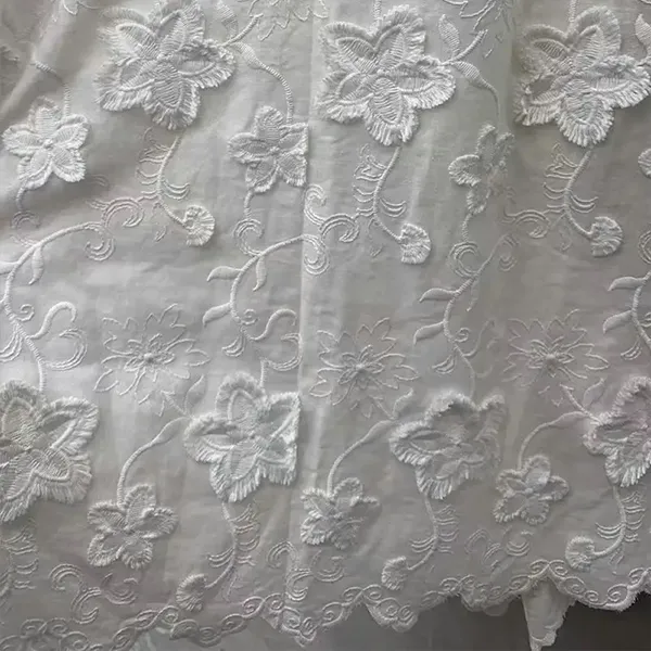 3D çiçek dekore edilmiş% 100 pamuklu nakış dantel kumaş, yükseltilmiş 3D çiçek nakış ve hassas kuşel kesme işçiliğine sahip kuşellik deliklerine sahip bu% 100 pamuklu dantel, gelin aşınması, elbiseler ve bluzlar için nefes alabilen zarafet sunuyor. Boyutsal tasarımlar yumuşaklık ve örtü korurken lüks doku yaratır. Romantik, vintage esintili moda için mükemmel.