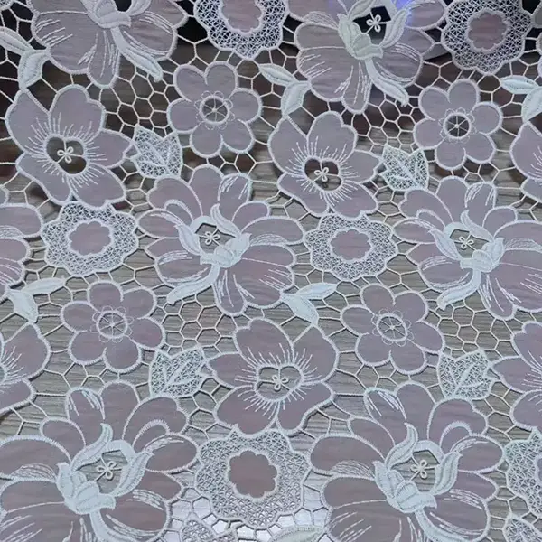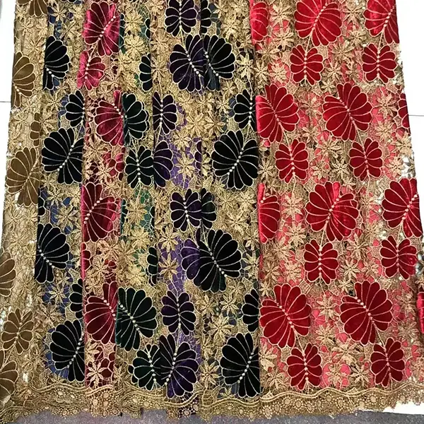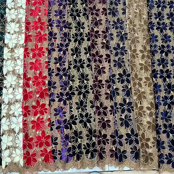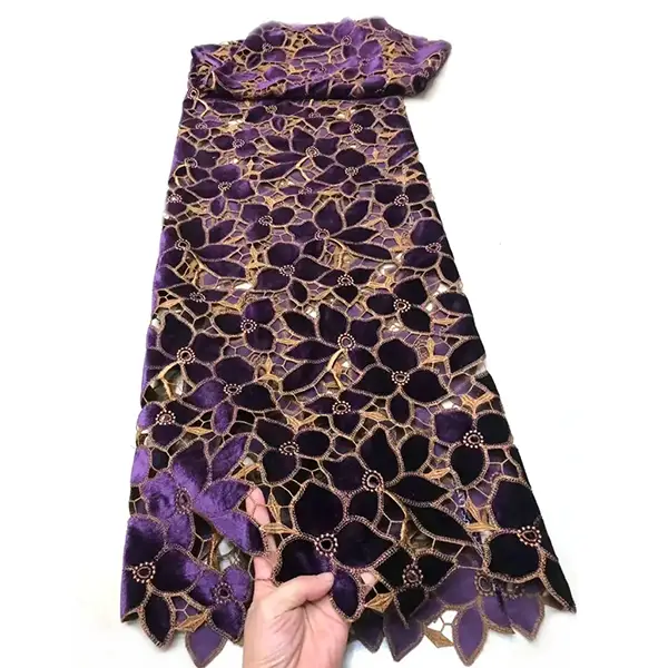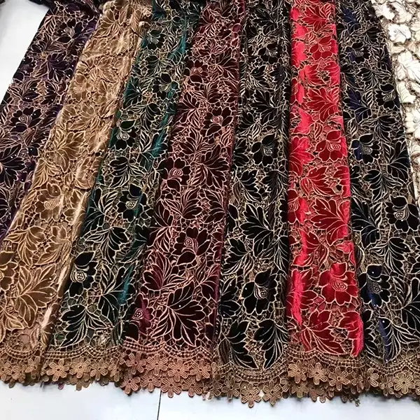Velvet lazer kesim çiçek desen dantel kumaş, yumuşak dokuyu hassas detaylı tasarımlarla birleştirerek karmaşık lazer kesilmiş çiçek dantel desenlerine sahip. Zarif moda (elbiseler, ceketler, gelinlik) ve dekor (perdeler, yastıklar) için idealdir.