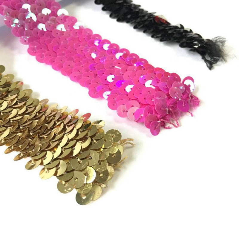 Farklı genişlikli kaplama Örgü elastik payet dantel trim, çoklu genişliklerde mevcuttur, parlak payetlerle eşleştirilmiş elastik bir tabana sahiptir ve ona parlak bir parlaklık verir. Sahne kostümleri, gece önlükleri ve ayakkabı ve şapka süslemeleri için uygundur